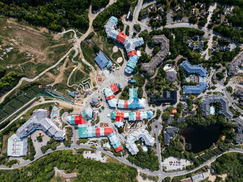 Вид с воздуха курортной деревни Монт-Тремблан, Квебек, Канада с озером, лесом и горным пейзажем летом