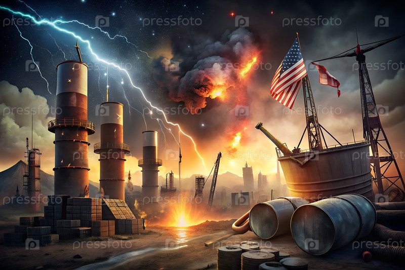 Редакционная иллюстрация энергетического конфликта США, баррелей нефти и горящего НПЗ, символизирующих геополитическую напряженность и войну