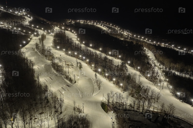 Ночной вид с воздуха освещенных лыжных трасс на горном курорте Броммонт в Квебеке, Канада зимой. g