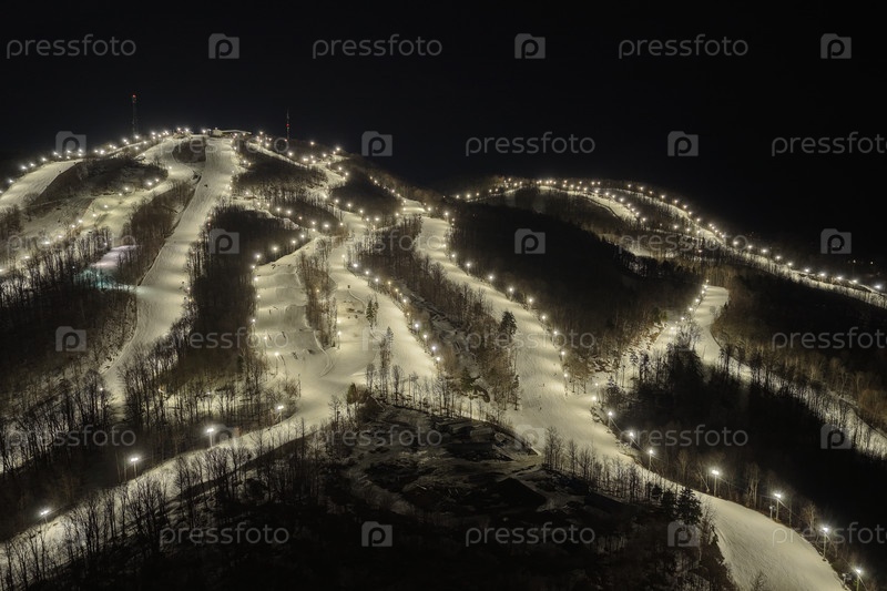 Ночной вид с воздуха освещенных лыжных трасс на горном курорте Броммонт в Квебеке, Канада зимой. g