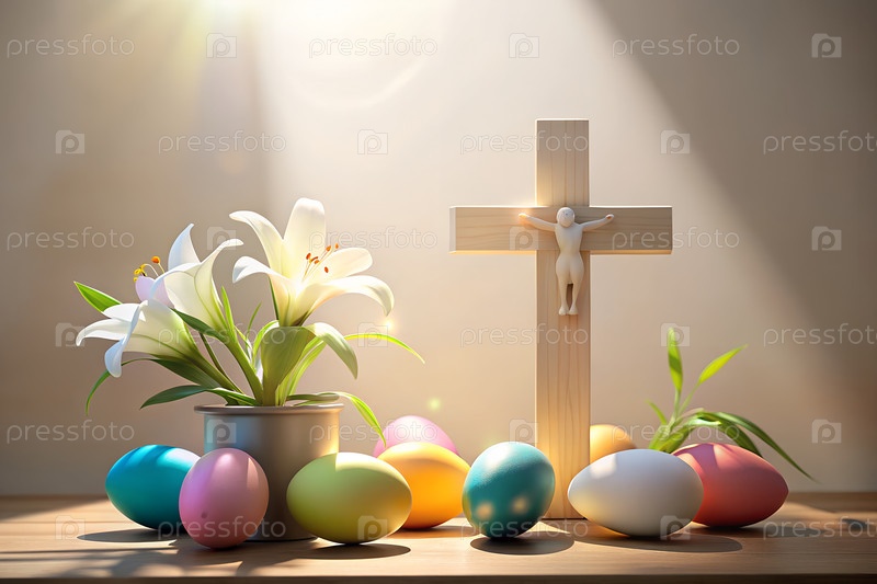 Христианские пасхальные натюрморты с деревянным крестом, лилиями и украшенными яйцами в весеннем солнечном свете символизируют сцену воскресения