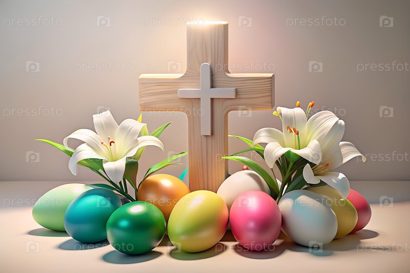 Христианские пасхальные натюрморты с деревянным крестом, лилиями и украшенными яйцами в весеннем солнечном свете символизируют сцену воскресения