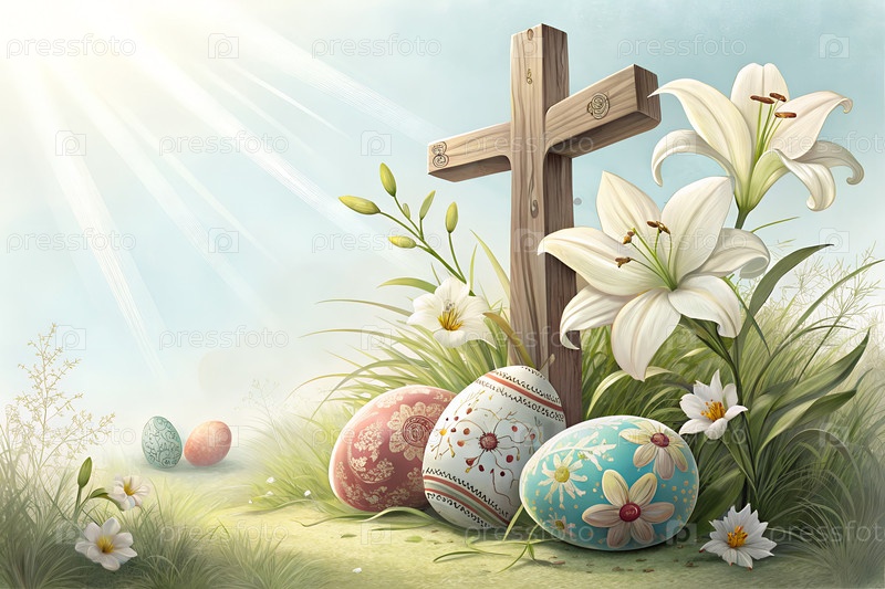 Христианские пасхальные натюрморты с деревянным крестом, лилиями и украшенными яйцами в весеннем солнечном свете символизируют сцену воскресения