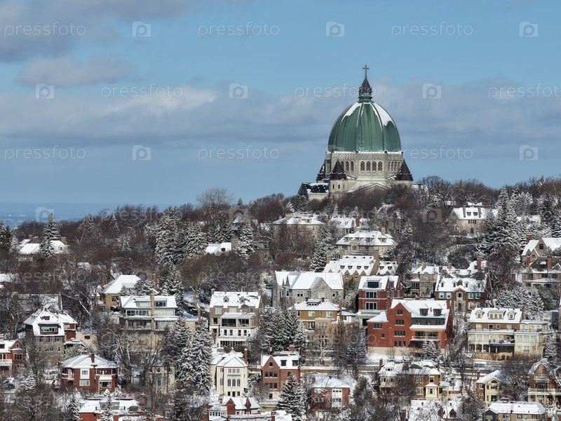 Купол Оратория Святого Иосифа над снежным районом Вестмаунта и Монреаля на холме Маунт-Рояль зимой, Квебек, Канада. g