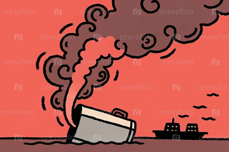 Редакционная иллюстрация энергетического конфликта США, баррелей нефти и горящего НПЗ, символизирующих геополитическую напряженность и войну