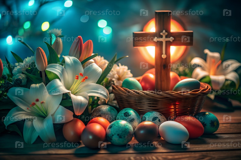 Христианские пасхальные натюрморты с деревянным крестом, лилиями и украшенными яйцами в весеннем солнечном свете символизируют сцену воскресения