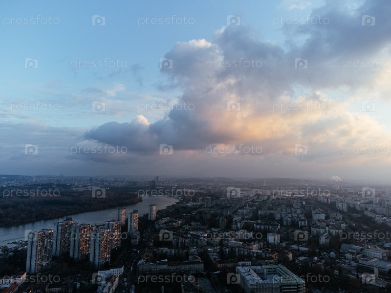 Полет беспилотника на закате над районом Земум, Белград, Сербия, Европа