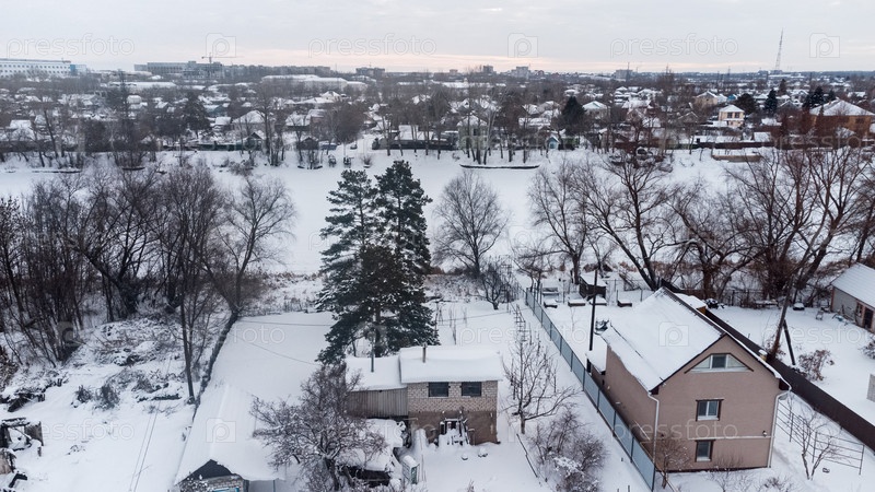 Вид с воздуха покрытых снегом домов возле замерзшей реки в Уральске, Казахстан, зимой. c