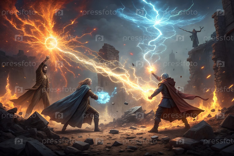 Эпическая фэнтезийная битва элементарных магов, бросающих огонь и молниеносную магию в вулканическом пустынном ландшафте