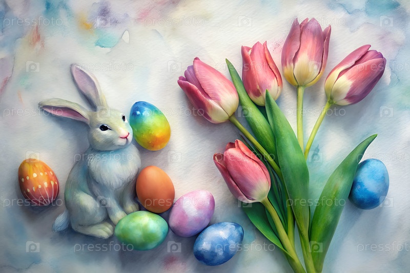 Пастельные пасхальные яйца, тюльпаны и милое украшение кролика на светлом фоне, весенние праздники плоская композиция. g
