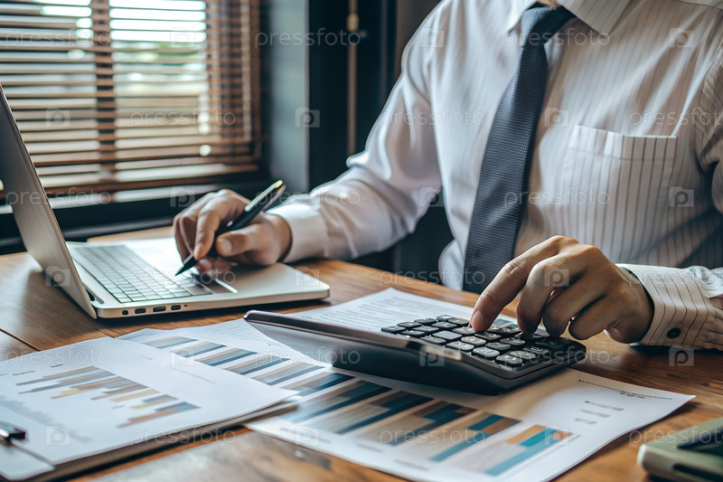 Бизнес-профессионал, анализирующий финансовые отчеты с помощью калькулятора и графиков на офисном столе. g