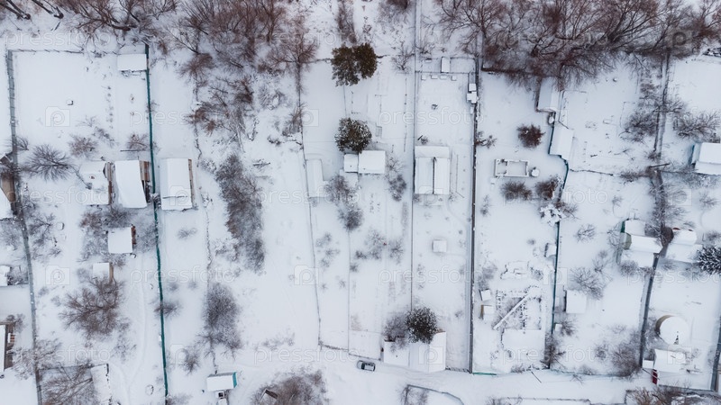 Вид с воздуха покрытых снегом домов возле замерзшей реки в Уральске, Казахстан, зимой. c