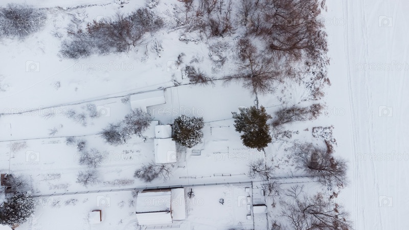 Вид с воздуха покрытых снегом домов возле замерзшей реки в Уральске, Казахстан, зимой. c