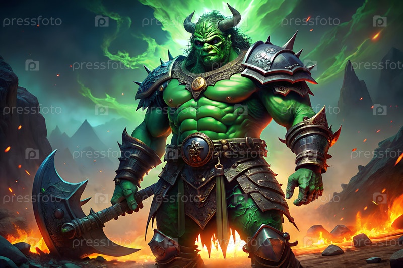 Эпический зеленый воин-орк с массивным топором на темном фэнтезийном поле битвы со светящейся магией и драматической атмосферой