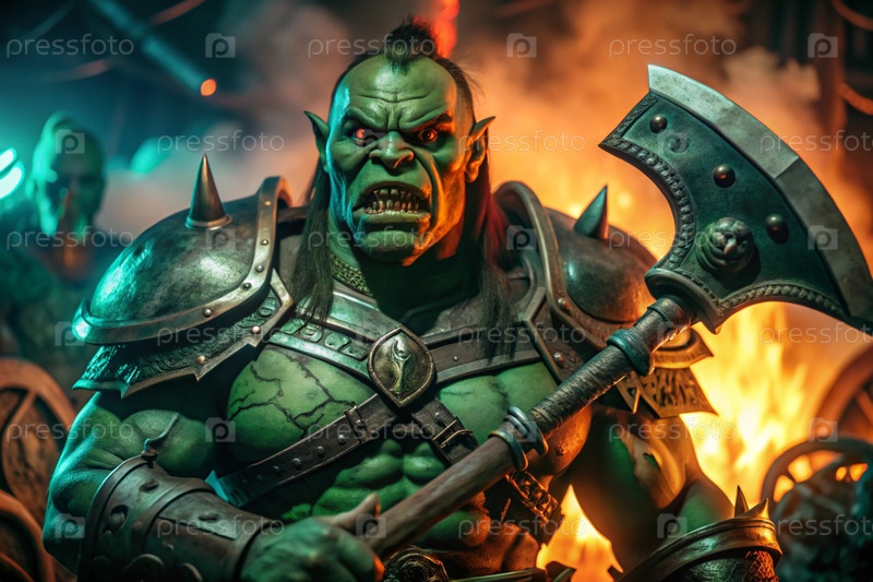Эпический зеленый воин-орк с массивным топором на темном фэнтезийном поле битвы со светящейся магией и драматической атмосферой