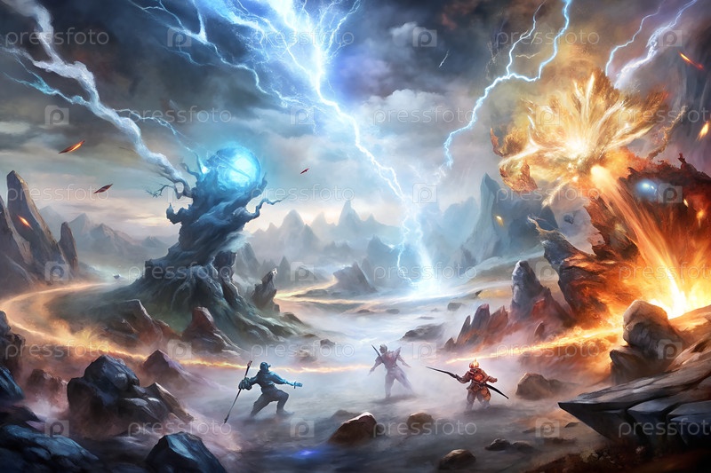 Эпическая фэнтезийная битва элементарных магов, бросающих огонь и молниеносную магию в вулканическом пустынном ландшафте
