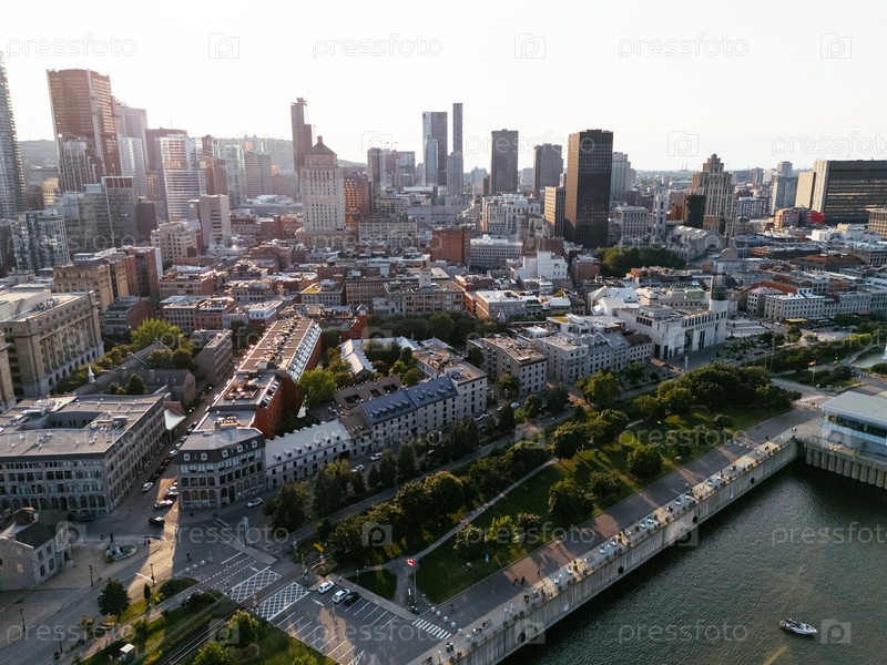 Монреаль на закате с городскими небоскребами, рассматриваемыми из старого порта