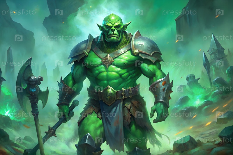 Эпический зеленый воин-орк с массивным топором на темном фэнтезийном поле битвы со светящейся магией и драматической атмосферой