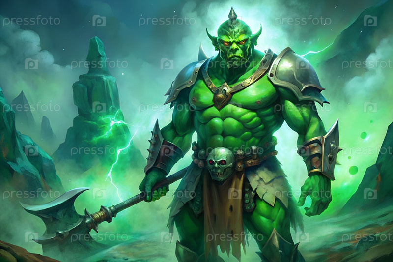 Эпический зеленый воин-орк с массивным топором на темном фэнтезийном поле битвы со светящейся магией и драматической атмосферой