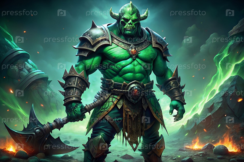 Эпический зеленый воин-орк с массивным топором на темном фэнтезийном поле битвы со светящейся магией и драматической атмосферой