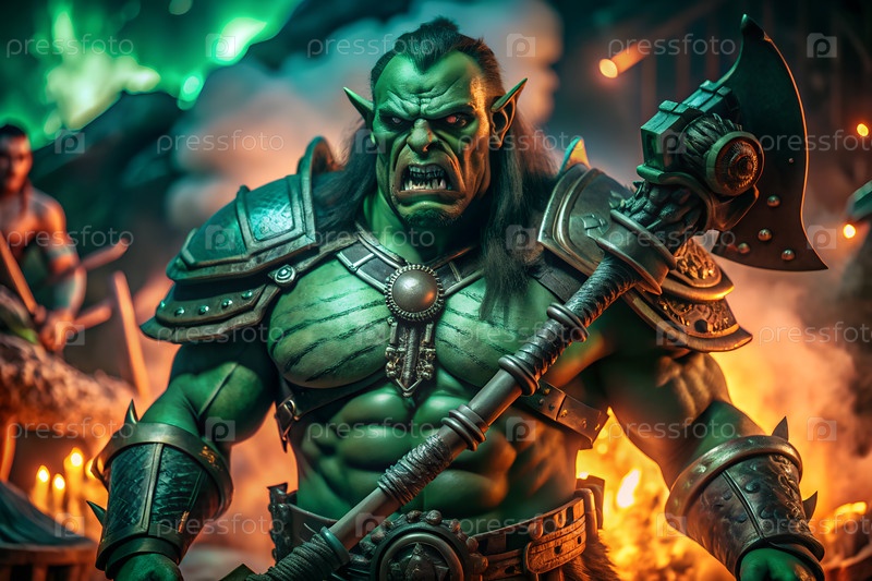 Эпический зеленый воин-орк с массивным топором на темном фэнтезийном поле битвы со светящейся магией и драматической атмосферой