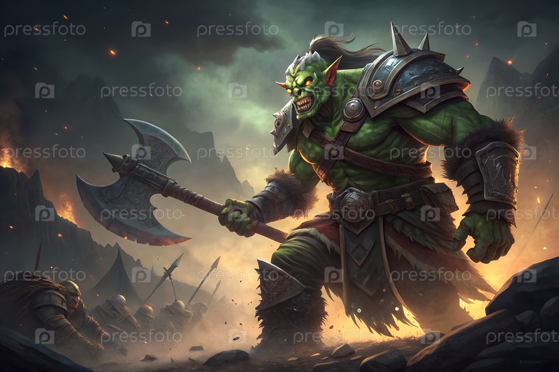 Эпический зеленый воин-орк с массивным топором на темном фэнтезийном поле битвы со светящейся магией и драматической атмосферой