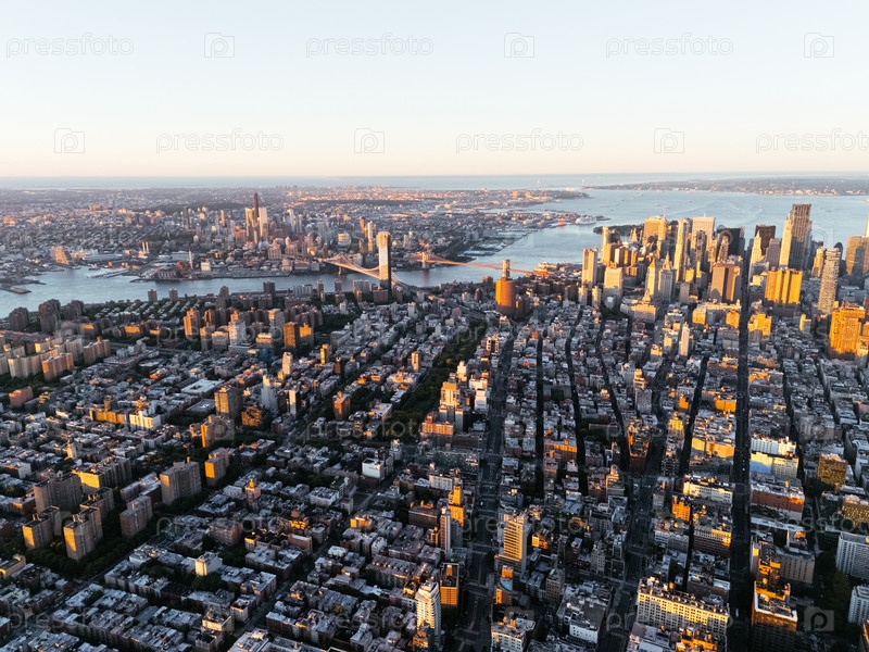 Вид из воздуха на горизонт Манхэттена при закате с золотым светом над Нью-Йорком и рекой Хадсон