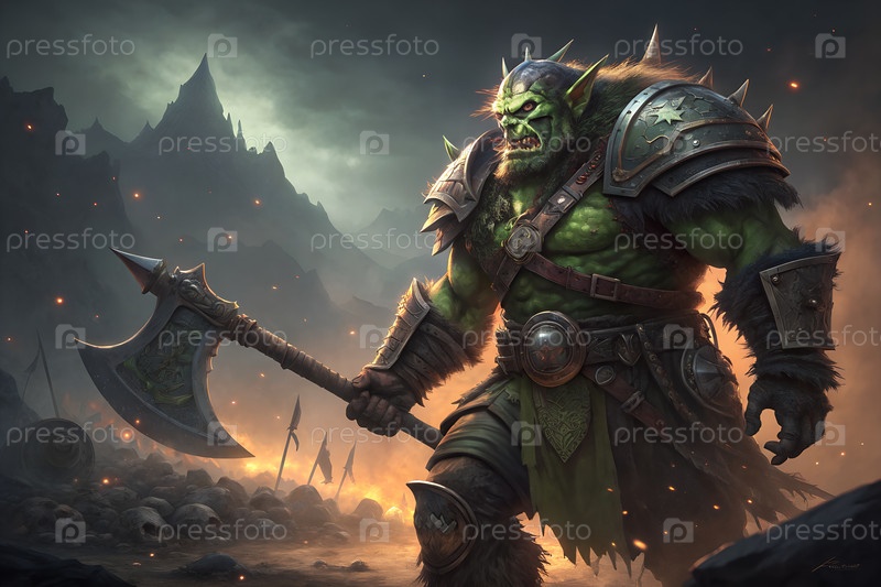 Эпический зеленый воин-орк с массивным топором на темном фэнтезийном поле битвы со светящейся магией и драматической атмосферой