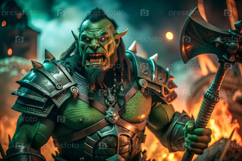 Эпический зеленый воин-орк с массивным топором на темном фэнтезийном поле битвы со светящейся магией и драматической атмосферой