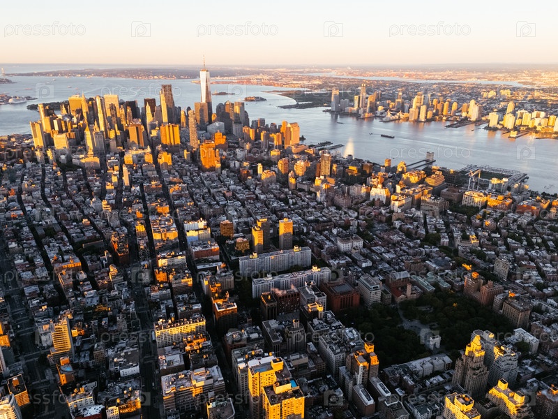 Вид из воздуха на горизонт Манхэттена при закате с золотым светом над Нью-Йорком и рекой Хадсон