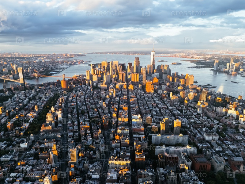 Вид из воздуха на горизонт Манхэттена при закате с золотым светом над Нью-Йорком и рекой Хадсон