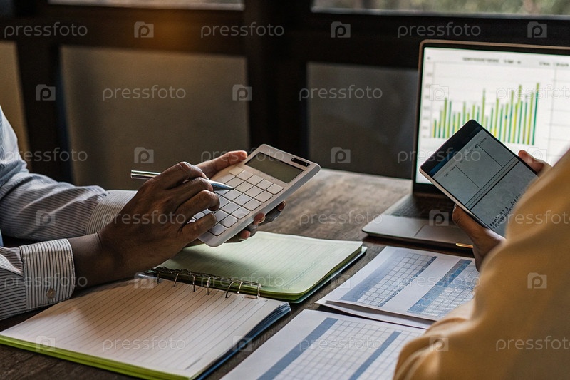 Бизнес-профессионал, анализирующий финансовые отчеты с помощью калькулятора и графиков на офисном столе. g