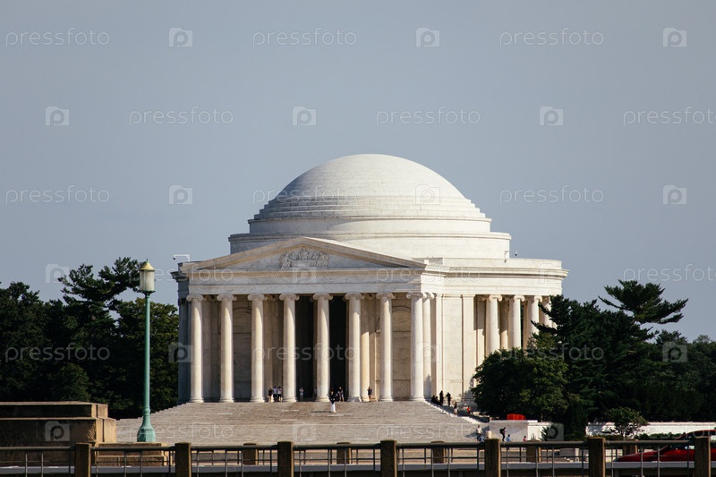Мемориал Джефферсона, обрамленный деревьями в солнечный день в Вашингтоне, США, знаковая неоклассическая достопримечательность