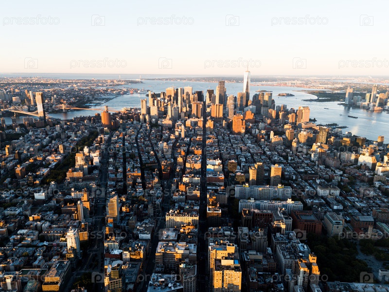 Вид из воздуха на горизонт Манхэттена при закате с золотым светом над Нью-Йорком и рекой Хадсон