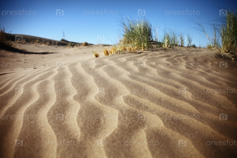 Скульптурные ветром пустынные дюны с волнистым песком и редкой травой под голубым небом