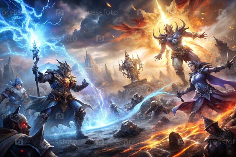 Эпическая фэнтезийная битва элементарных магов, бросающих огонь и молниеносную магию в вулканическом пустынном ландшафте
