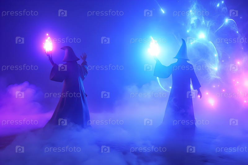 Фантастические волшебники сражаются со светящимися магическими заклинаниями на пейзаже туманных холмов, силуэтами в мистической атмосфере