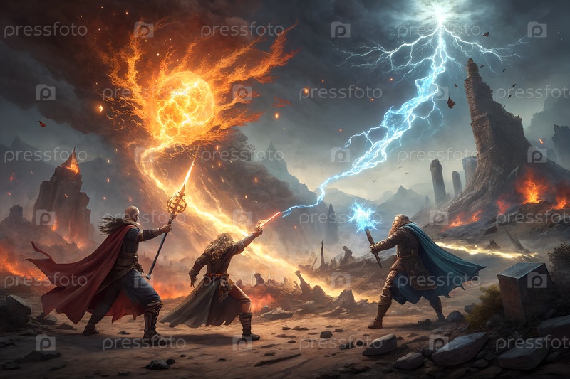 Эпическая фэнтезийная битва элементарных магов, бросающих огонь и молниеносную магию в вулканическом пустынном ландшафте