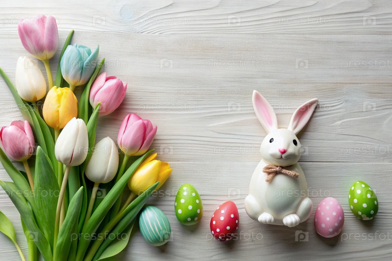 Пастельные пасхальные яйца, тюльпаны и милое украшение кролика на светлом фоне, весенние праздники плоская композиция. g