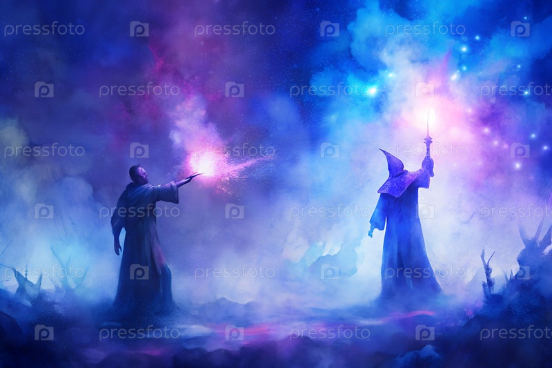 Фантастические волшебники сражаются со светящимися магическими заклинаниями на пейзаже туманных холмов, силуэтами в мистической атмосфере