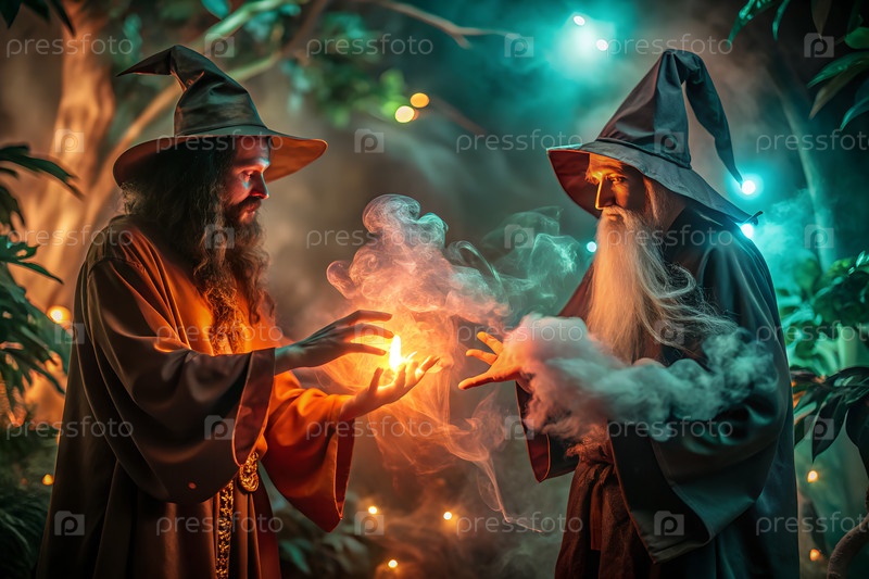 Фантастические волшебники сражаются со светящимися магическими заклинаниями на пейзаже туманных холмов, силуэтами в мистической атмосфере