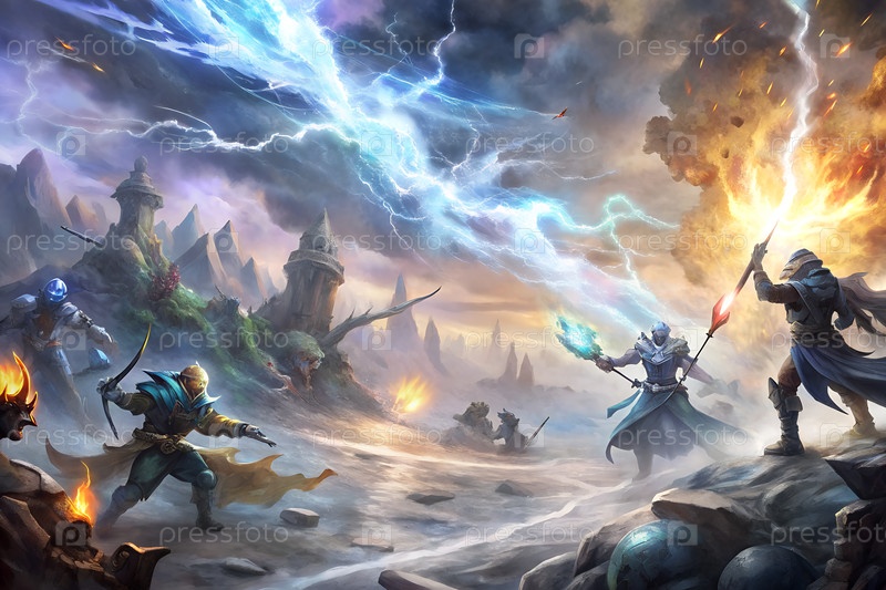 Эпическая фэнтезийная битва элементарных магов, бросающих огонь и молниеносную магию в вулканическом пустынном ландшафте