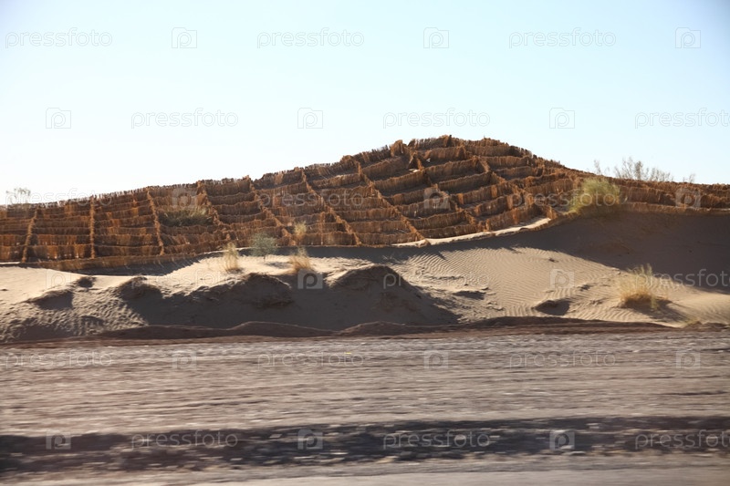 Скульптурные ветром пустынные дюны с волнистым песком и редкой травой под голубым небом