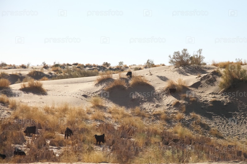 Скульптурные ветром пустынные дюны с волнистым песком и редкой травой под голубым небом