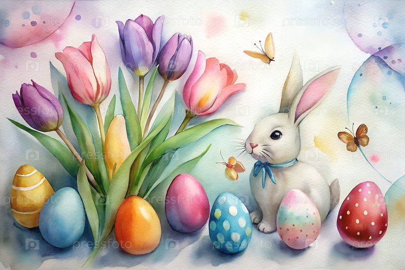 Пастельные пасхальные яйца, тюльпаны и милое украшение кролика на светлом фоне, весенние праздники плоская композиция