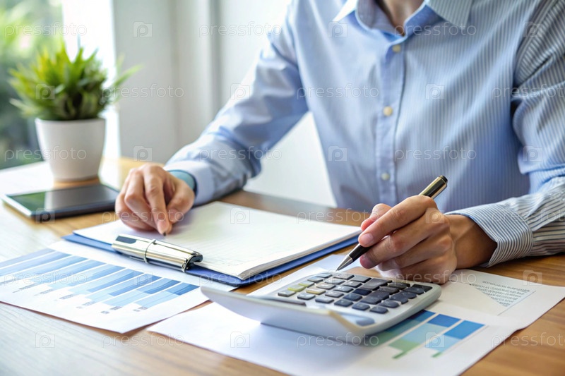 Бизнес-профессионал, анализирующий финансовые отчеты с помощью калькулятора и графиков на офисном столе