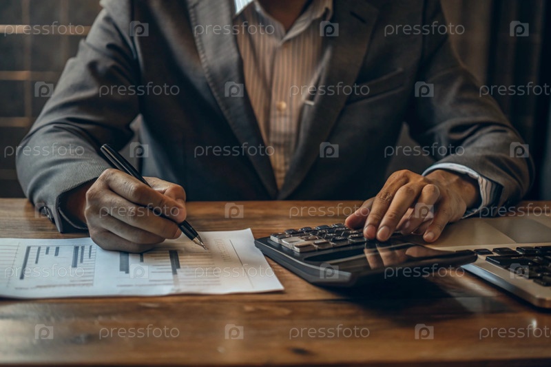 Бизнес-профессионал, анализирующий финансовые отчеты с помощью калькулятора и графиков на офисном столе