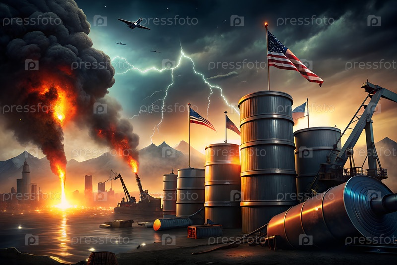 Редакционная иллюстрация энергетического конфликта США, баррелей нефти и горящего НПЗ, символизирующих геополитическую напряженность и войну