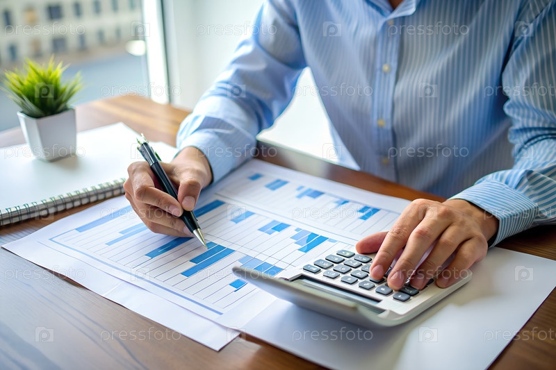 Бизнес-профессионал, анализирующий финансовые отчеты с помощью калькулятора и графиков на офисном столе. g