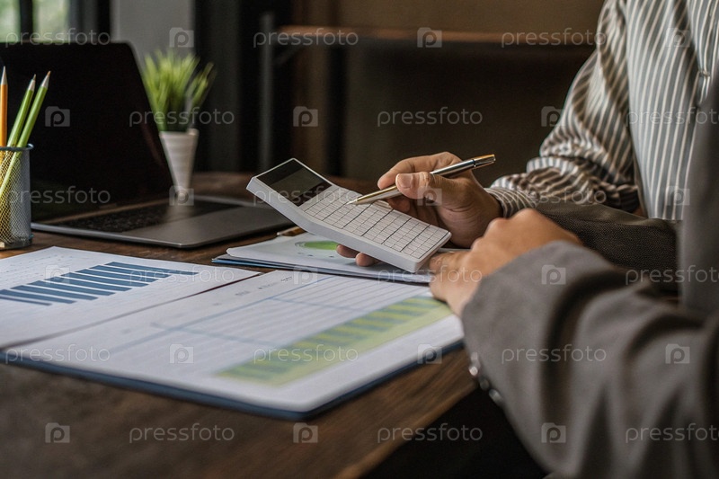 Бизнес-профессионал, анализирующий финансовые отчеты с помощью калькулятора и графиков на офисном столе